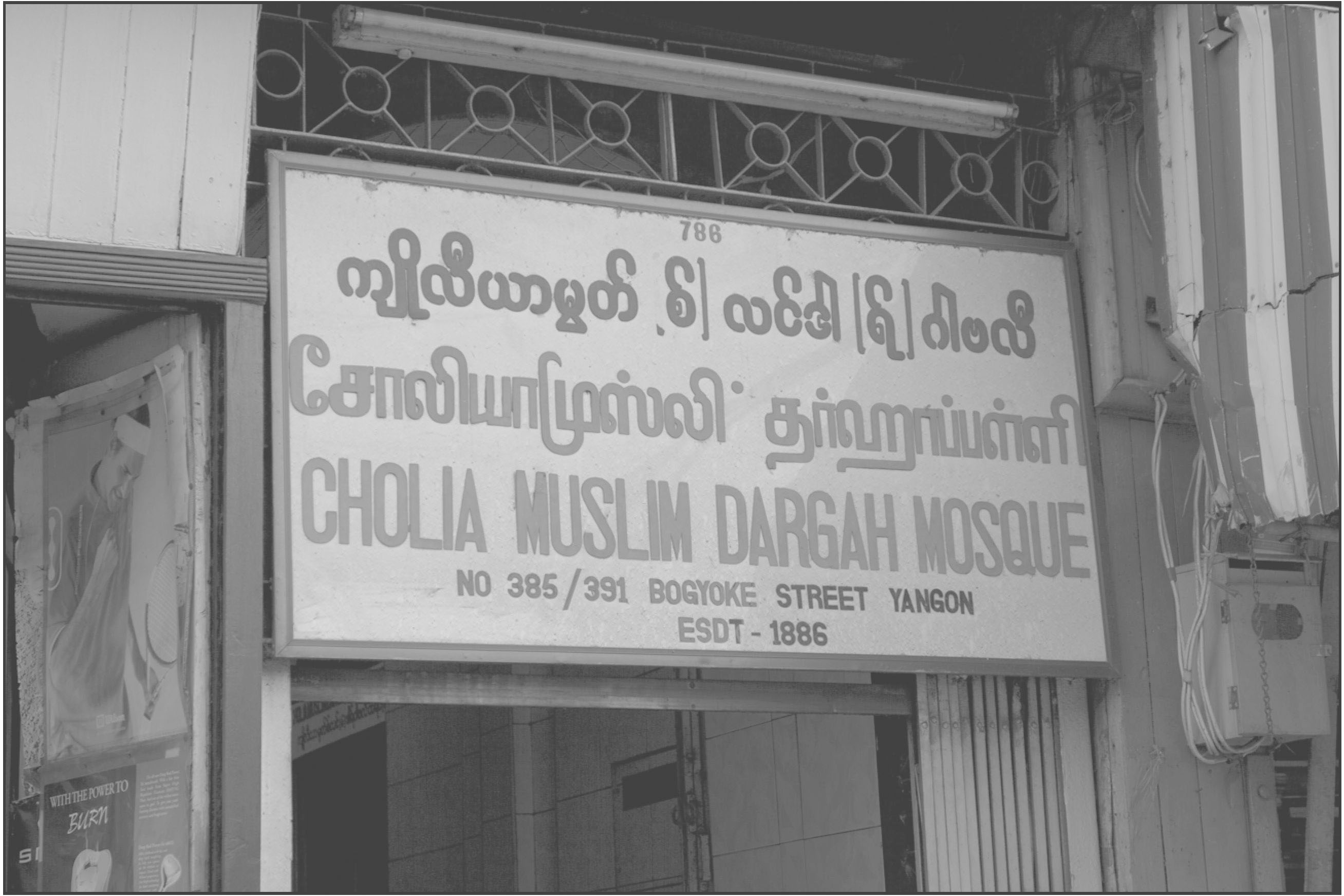 图17 仰光朱罗人圣陵清真寺的招牌。仰光市中心的街道仍然是一个长期定居的庞大印度社群的家园 (苏尼尔·阿姆瑞斯 摄)