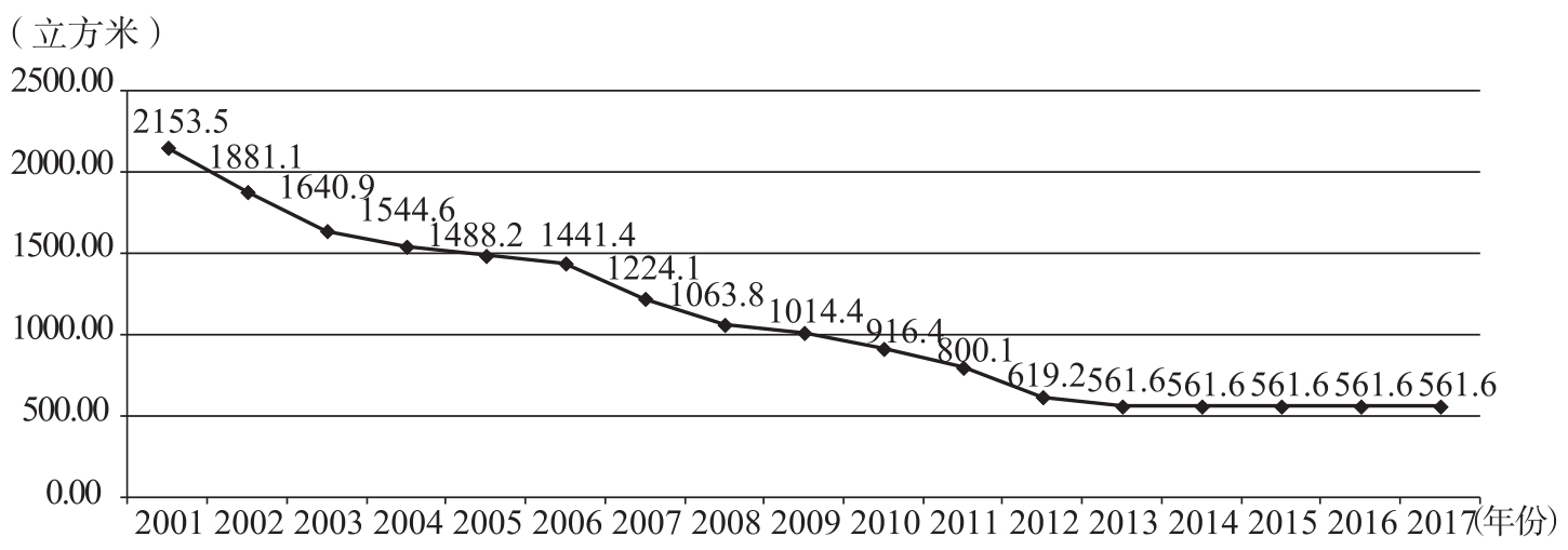 在节水方面,以设施农业、精品果园和基本农田为重点,大力推进高效节水灌溉工程建设,田间节水工程设施农业以微灌为主,精品果园以小管出流、滴灌为主,规模基本农田中两茬平播以喷灌为主、露地菜以管灌为主。根据北京市水务局数据,北京农业用水占全市总用水量的比重由2001年的44.7%下降到2017年的12.9%(如图3-1所示)。农业用水效率即万元农业GDP耗水由2001年的2153.5立方米下降为2017年的561.6立方米(如图3-2所示)。预计到2022年,北京市农业灌溉水利用系数将提高到0.75以上,达到发达国家水平。