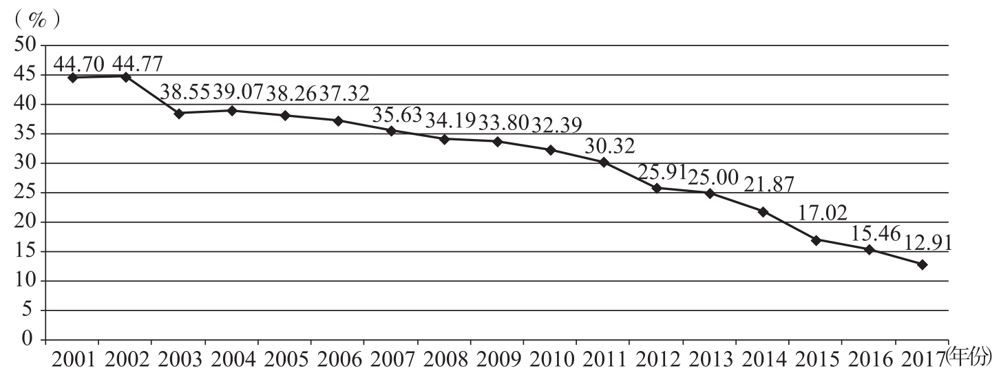 图3-1 2001—2017年北京农业用水占全市总用水量