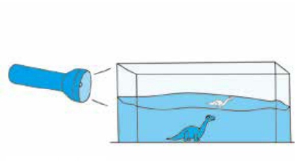 3.把塑料玩具放在鱼缸的窄面,用手电筒照亮它,然后在对面观察,可以发现除了在鱼缸的下面能看到玩具外,在顶部也可以看到一个,这个就是海市蜃楼的蜃景了。