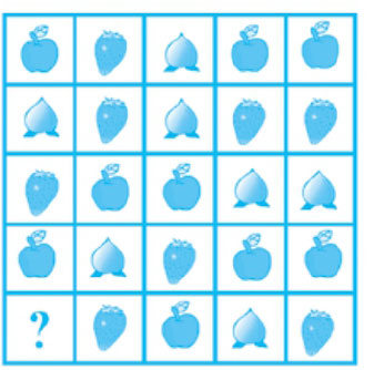 下图中,苹果、草莓和桃子3种水果按照一定的规律摆放在25个空格里。好好观察它们摆放的顺序,思考一下,问号处应该放哪一种水果? cZ//PiDt3QwkqTOlZqAQJpAqNSUInGrfBOvlcCLqMETqlKTHP4L4ilH/QQmHACtP