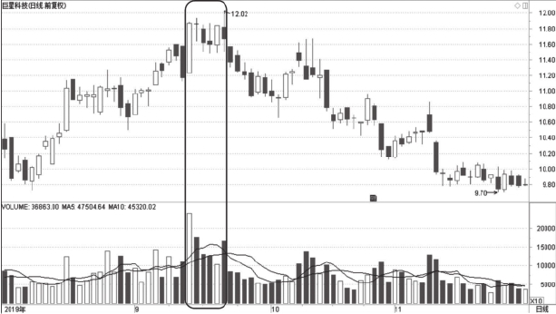 图1-5为巨星科技2019年8月至11月走势图,在股价的一波上涨走势中,股价于短线高点横向震荡整理,此时的成交量明显放大,这是此位置区域中多空分歧加剧的标志。在这个位置点,上攻明显受阻,剧烈的多空分歧将使股价走势再次发生变化。结合股价的短线上涨情况来看,股价走势反转回调的概率更大一些。