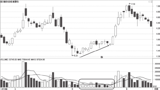 图1-6为百川股份2019年3月至6月走势图,在图中标注处股价震荡上行,量能未见放大,该股筹码处于“求大于供”的状态中。如果此时的震荡区间位于相对低位区,那这种筹码供求关系多预示着突破上升的走势。