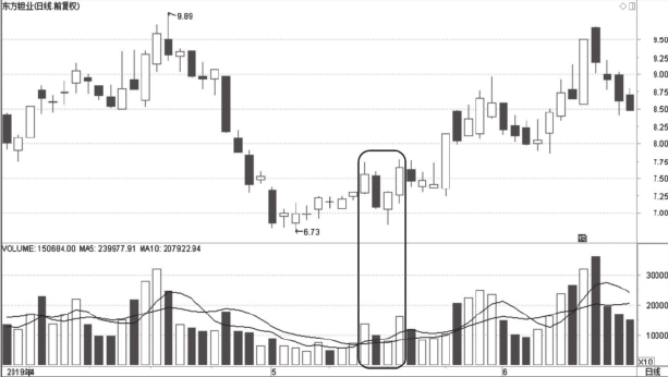图1-9为东方钽业2019年4月至6月走势图,股价在经历了大幅下跌之后,先在低位区止跌企稳,随后放量上涨。结合随后短线高点的强势企稳、不回落的股价走势来看,这波温和放量上涨体现了主力能力较强、拉升阻力较小。由于股价的上涨走势才刚刚展开,因而,随后仍有较大的上涨空间。