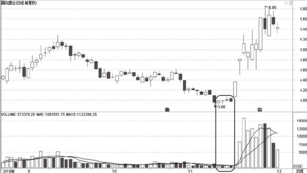图1-8为国风塑业2019年8月至12月走势图,股价在中短线大幅下跌之后,出现了企稳走势,此时的成交量大幅萎缩。结合股价之前的下跌情形来看,这是短期内做空力量消失的信号,股价中短线的连续大幅下跌已使得该股在短期内处于超卖状态。成交量的形态变化可以作为判断反弹行情的依据,可以提前预示股价运行方向。