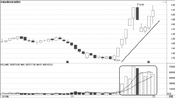 图1-7为长城动漫2019年10月至12月走势图,在图中标注处股价稳步上涨时,可以看到此时的成交量一直处于温和放大的状态。温和放大的量能代表着股价上涨时的动力,只要这种量价关系可以有效地保持,股价的上涨就具有较强的持续性。