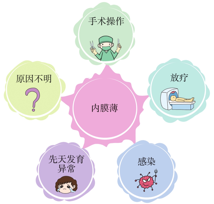 在正常情况下,随着卵泡的发育,雌激素的升高,子宫内膜增厚。而一部分女性的子宫内膜始终很薄,在卵泡发育甚至是外用药物的情况下均不能让子宫内膜增厚。究竟子宫内膜多薄才算薄?有人说子宫内膜厚度达不到5mm,有人说6mm,大部分观点倾向于低于7mm,如果要说最适合怀孕的子宫内膜厚度,一般认为8~14mm比较合适。那么,子宫内膜薄究竟是什么原因造成的?原因主要包括:手术操作、放疗、感染、先天发育异常、原因不明等(图2-9)。