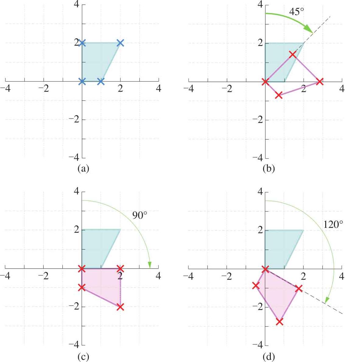 如图1.17所示是初始形状分别绕原点顺时针旋转45°、90°和120°三种情况。请读者自行编写MATLAB绘制图1.17。