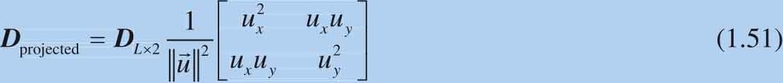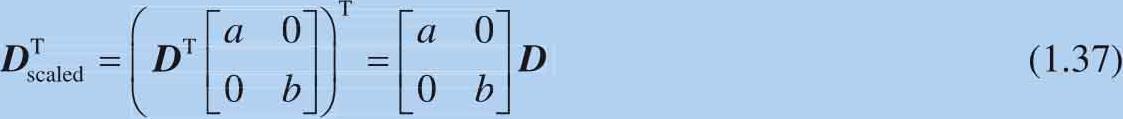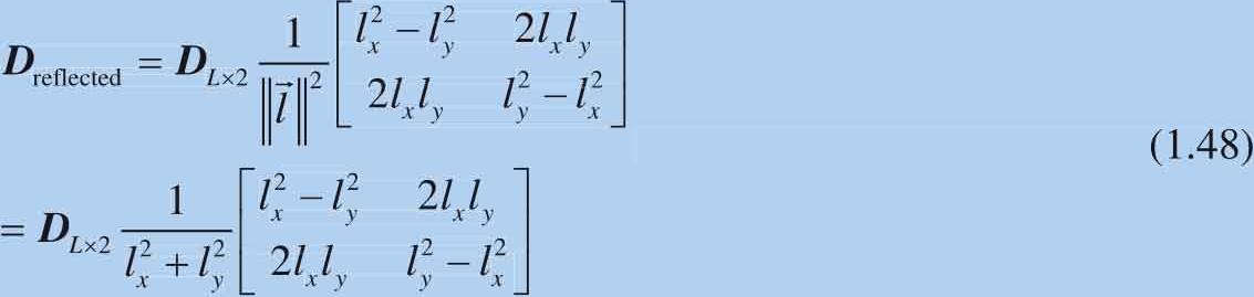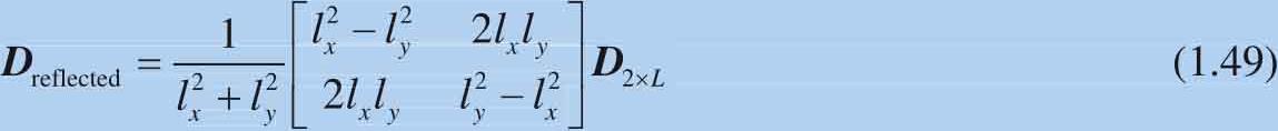 这个2×2的矩阵为对角阵,因此矩阵的转置为其本身。也就是说维度以行来表达时,沿直线镜像得到的数据可以通过式(1.49)计算: