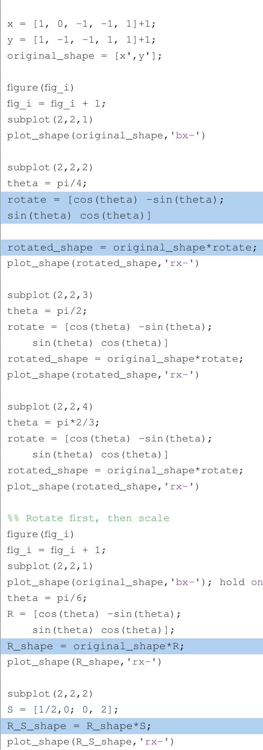 请读者自行编写代码绘制图形绕原点逆时针旋转。如果数据维度以行来表达,进行旋转运算的形式如下:
