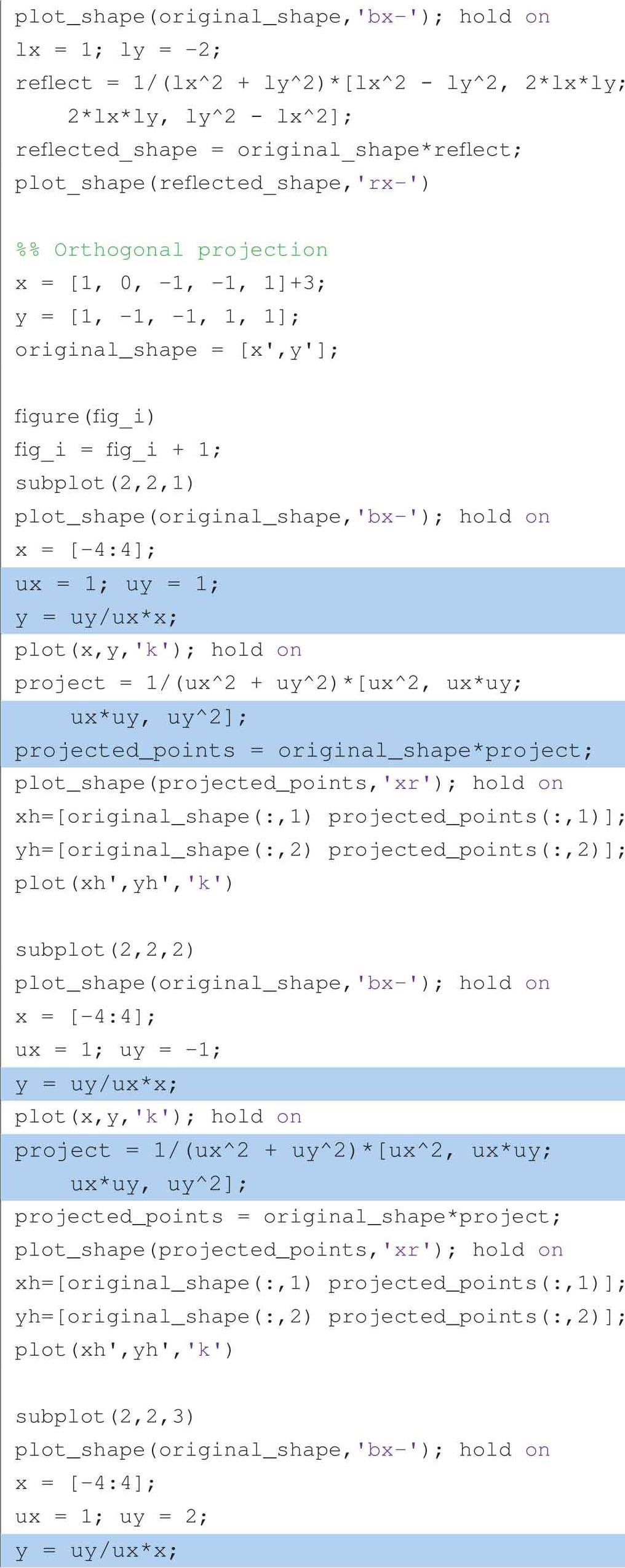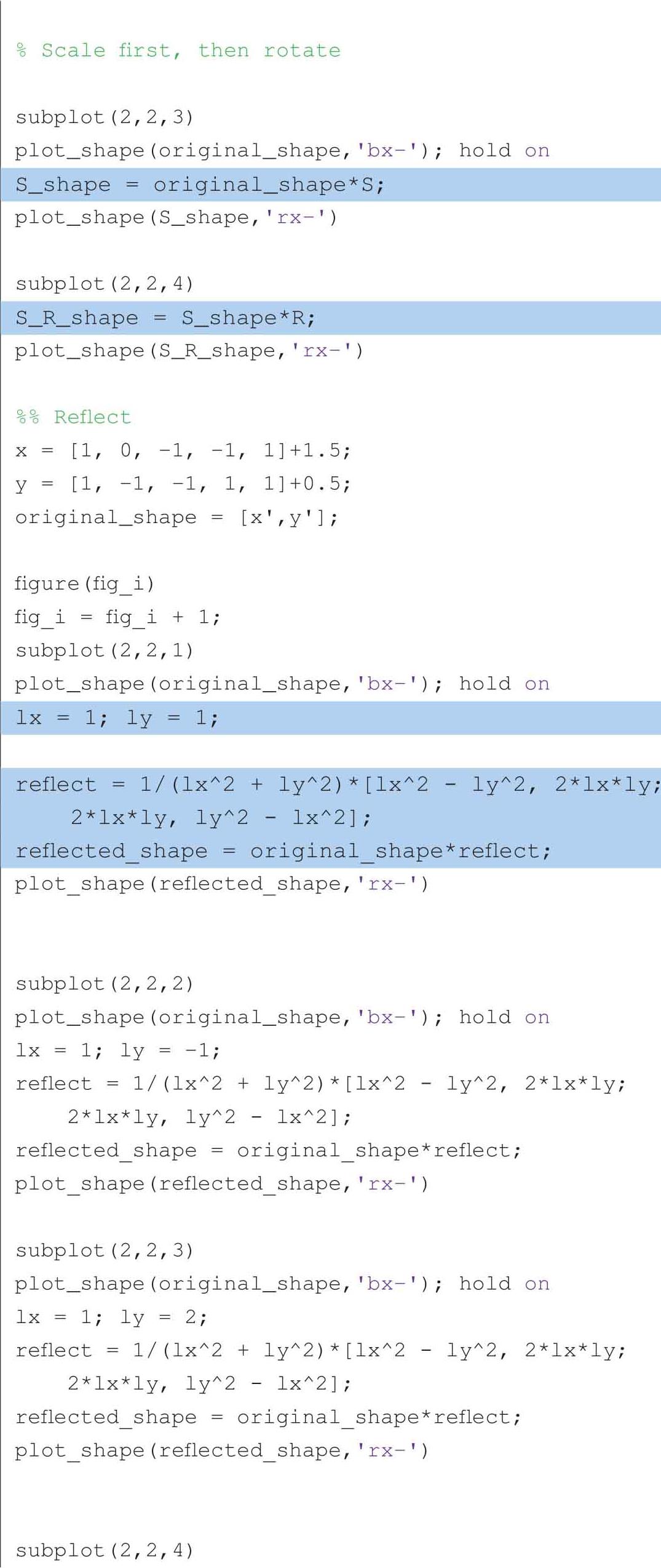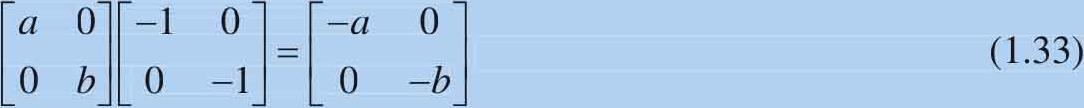 很明显,如图1.15所示,经过 R =[-1,0;0,-1]处理得到的图形和原图形 以原点中心对称 (central symmetry with respect to origin),相当于图形绕原点顺时针旋转180°。而[-1,0;0,1]的效果是以 y 轴做镜像对称。[1,0;0,-1]产生的效果则是以 x 轴做镜像对称。这里初次提到旋转和对称的特殊情况,随后会进一步介绍。