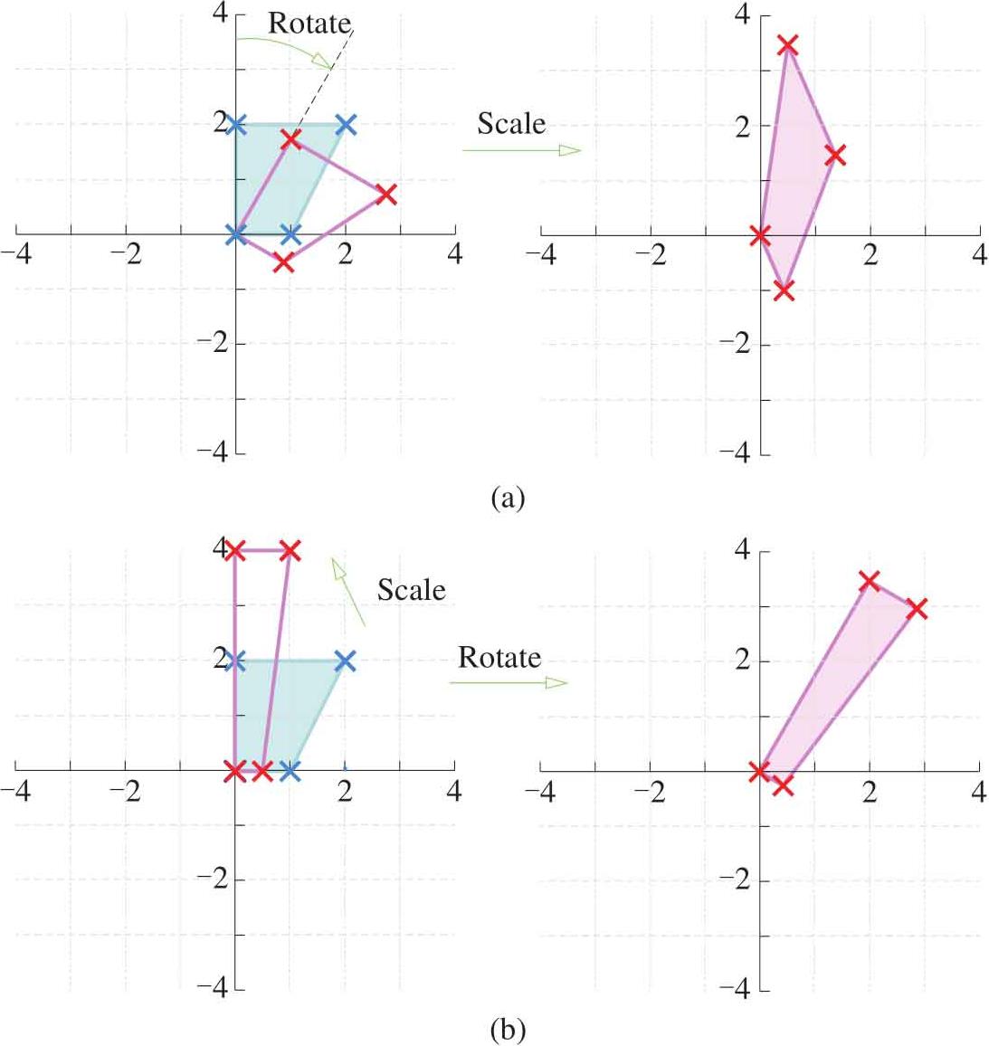 如图1.19所示,是数据先旋转后缩放以及先缩放后旋转得到的不同结果。再次说明,对于两个方阵 A 和 B ,一般情况 AB 和 BA 两种乘积结果不同。上文看到的一个特例是,当 A 和 B 都是对角方阵, AB 和 BA 两种乘积结果相同。