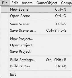 File菜单主要用于打开和保存场景项目,同时也可以创建场景。其中,New Scene(Ctrl+N)用于创建一个新的场景;Open Scene(Ctrl+O)用于打开一个已经创建的场景;Save Scene(Ctrl+S)用于保存当前场景;Save Scene as(Ctrl+Shift+S)用于另存当前场景;New Project(新建工程)用于新建一个新的项目工程;Open Project(打开工程)用于打开一个已经创建的工程;Save Project(保存工程)用于保存当前项目;Build Settings(Ctrl+Shift+B)用于工程发布的相关设置;Build&Run(Ctrl+B)用于工程发布并运行项目;Exit(退出)用于退出Unity3D。