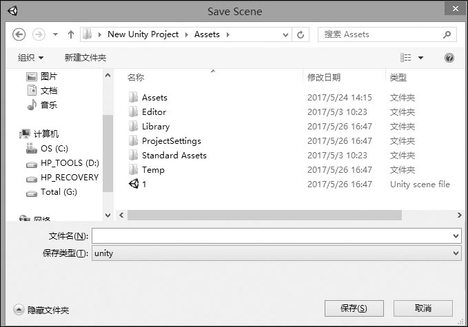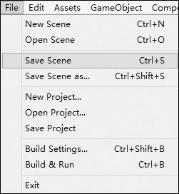 首先单击File(文件)→Save Scene(保存场景)菜单命令或按Ctrl+S快捷键,如图2.47所示。在弹出的“保存场景”对话框中,输入要保存的文件名,如图2.48所示。此时在Project(项目)面板中能够找到刚刚保存的场景。接下来,单击File(文件)→Save Project(保存项目)菜单命令,保存项目,完成整个保存工作。