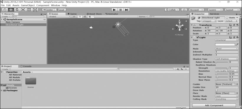 在Project name下(项目名称)中输入项目名称,然后在Location(项目路径)下选择项目保存路径并且选择2D或者3D工程的默认配置,最后单击Add Assets Package按钮选择需要加载的系统资源包,如图2.45所示。设置完成后,单击页面右下角的Create Project按钮完成新建项目。Unity会自动创建一个空项目,其中会自带一个名为Main Camera的相机和一个Directional Light的直线光,如图2.46所示。