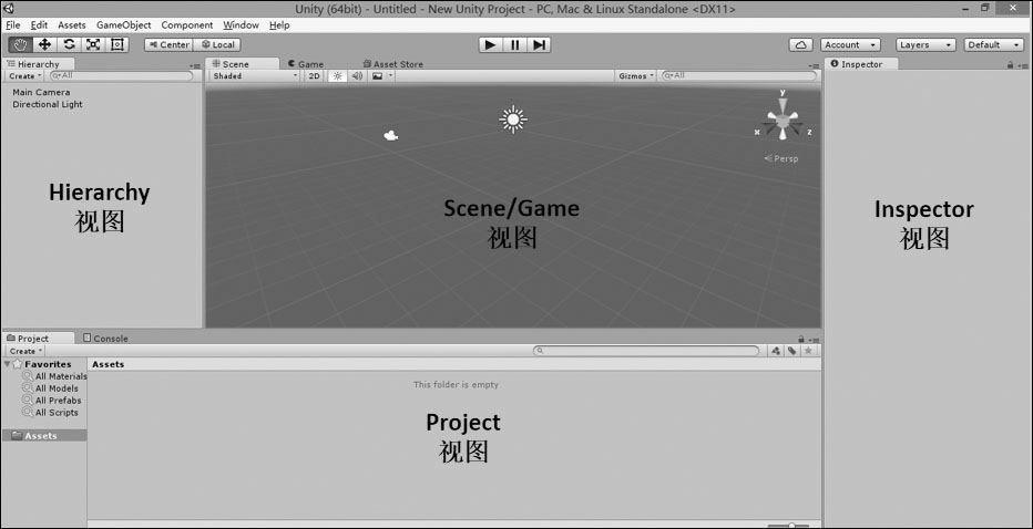 Unity3D拥有强大的编辑界面,开发者在创建项目过程中可以通过可视化的编辑界面创建项目。Unity3D的基本界面非常简单,几个窗口就可以实现几乎全部的编辑功能,主要包括菜单栏、工具栏及五大视图,可供开发者在较短时间内掌握相应的基础操作方法。