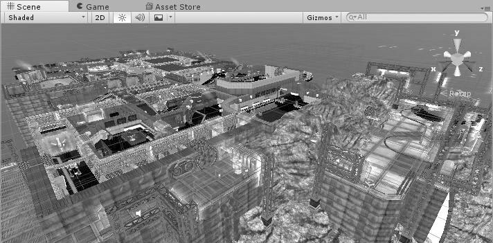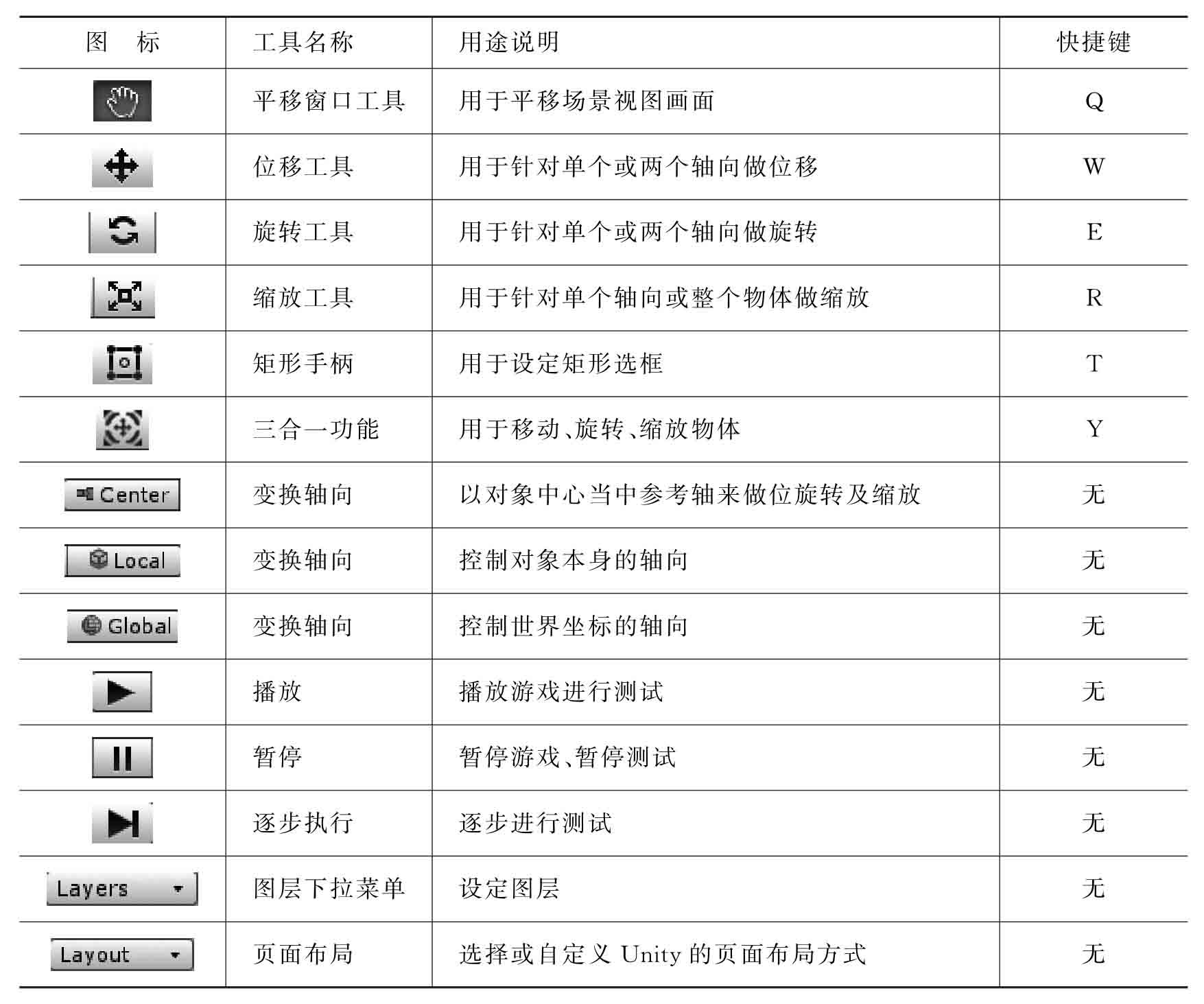 Scene(场景)视图上端的视图控制栏,此选项用于改变相机查看场景的方式。从左到右依次是Shaded、2D、灯光、声音、特效、Gizmos等按钮。其中,Shaded按钮主要用来切换绘图模式;2D按钮用来切换2D与3D视图;灯光按钮用来控制场景中灯光的打开与关闭;声音按钮用来控制场景中声音的打开与关闭;图片按钮用来控制场景中天空球、雾效、光晕等组件的显示与隐藏;Gizmos按钮用来控制场景中光源、声音、相机等对象的显示与隐藏;Gizmos按钮右侧视图板块用来查找物体。