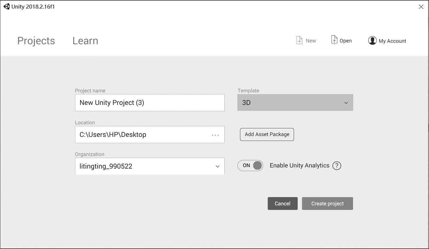 Unity创建游戏的理念可以被简单地理解为:一款完整的游戏就是一个Project(项目工程),游戏中不同的关卡对应的是项目下的Scene(场景)。一款游戏可以包含若干个关卡(场景),因此一个项目工程下面可以保存多个场景。首先双击Unity图标创建一个项目,如图2.43所示。