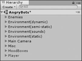 Unity中Hierarchy(层次)视图,用于显示当前场景的所有游戏对象(Game Object),同时,在Hierarchy(层次)视图中,开发者可以通过对游戏对象建立父子级别的方式对大量对象的移动和编辑进行更加精确和方便的操作,如图2.36所示。