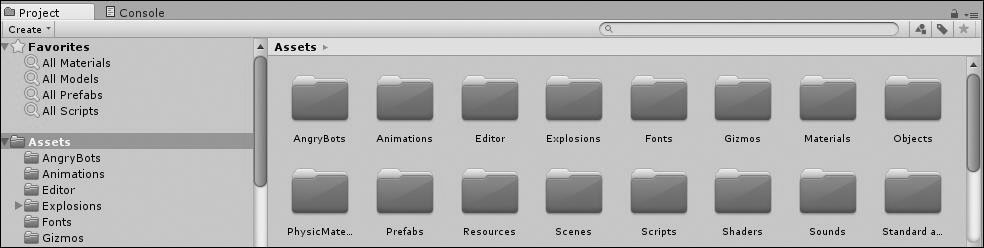 在Project(项目)视图中,在项目视窗最顶部的是一个浏览器工具条。在最左边的是一个Create菜单,单击Create按钮,则会开启与Assets菜单下Create命令相同的功能,开发者可以通过其创建脚本、阴影、材质、动画、UI等资源。