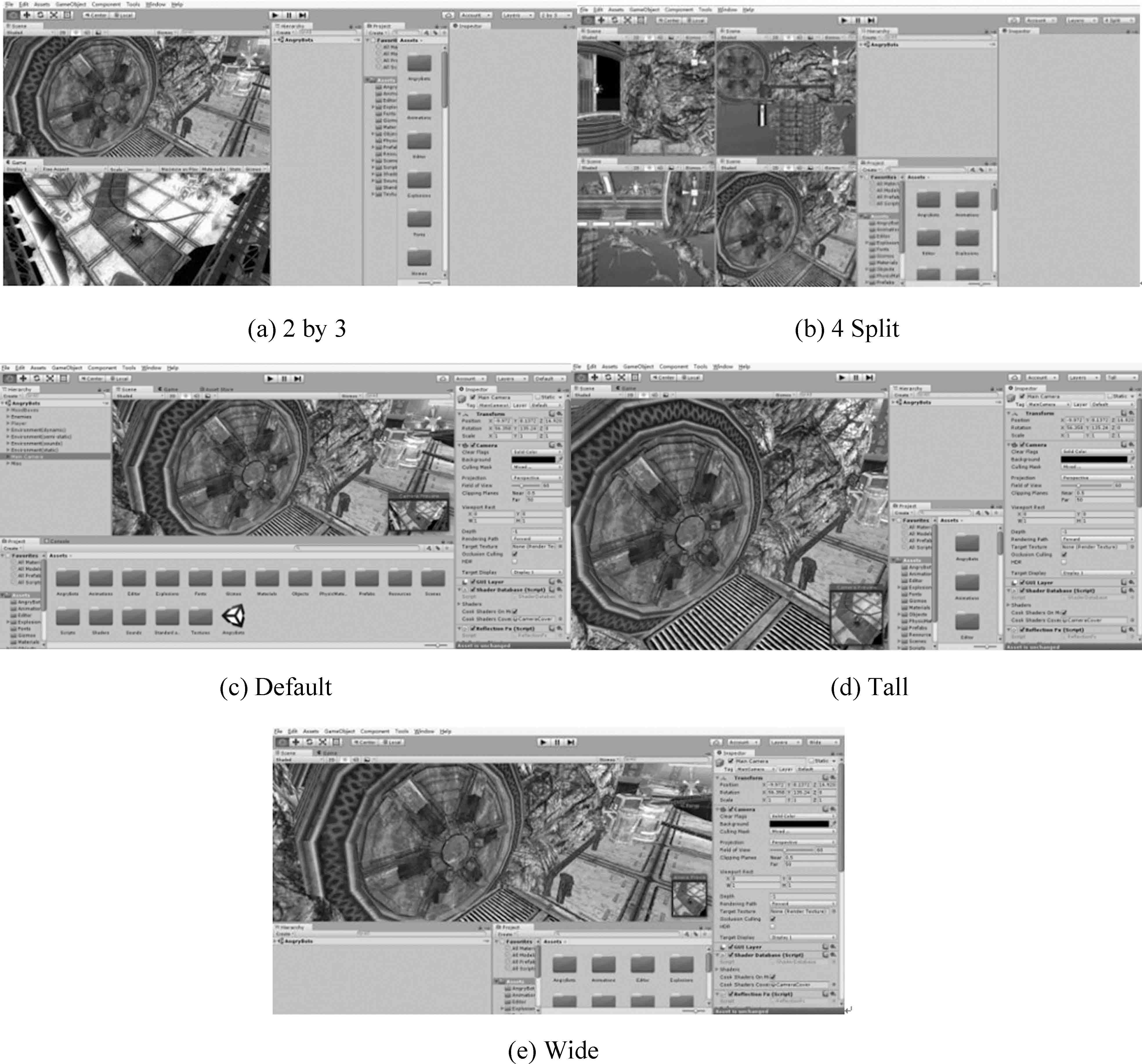 在Unity中有几种类型的视图,每种视图都有指定的用途。右上角Layouts按钮用于改变视图模式,单击Layouts选项,可以在下拉框中看到有很多种视图,其中有2 by 3、4 Split、Default、Tall、Wide等,如图2.33所示。其中,2 by 3布局是一个经典的布局,很多开发人员都使用这样的布局。4 Spilt窗口布局可以呈现4个Scene场景视图,通过控制4个场景可以更清楚地进行场景的搭建。Wide窗口布局将Inspector视图放置在最右侧,将Hierarchy视图与Project视图放置在一列。Tall窗口布局将Hierarchy视图与Project视图放置在Scene视图的下方。当自定义好窗口布局时单击Windows→Layouts→Save Layout,然后在弹出来的小窗口中输入自定义窗口的名称,单击Save按钮,可以看到窗口布局的名称是“自定义”。