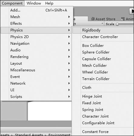 (4)Physics(物理组件):为了让创造的场景更具有真实性,需要在虚拟现实世界中让物体遵循现实世界的物理规则。为了实现这一点,Unity内置了NVIDIA PhysX物理引擎,以此模拟真实的物理行为。