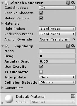 游戏物体组件可以通过Inspector(属性编辑器)进行显示,其本身也可以附加很多组件,如Rigidbody(刚体)。选中Cube(立方体),执行Component(组件)→Physics(物理)→Rigidbody(刚体)菜单命令,为游戏物体Cube(立方体)添加一个Rigidbody(刚体)组件,如图2.51和图2.52所示。