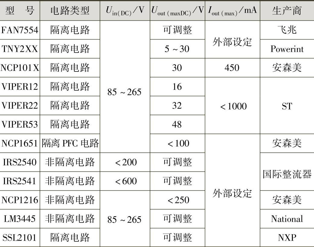 全电压交流转直流(AC-DC)类IC的输入电压为国际电压,即AC 85~265V,该电压范围能满足世界各国的电网电压要求,由该类IC组成的驱动器给使用者带来了极大的方便。可以实现全电压类驱动的IC型号较多,其主要性能见表1-11。