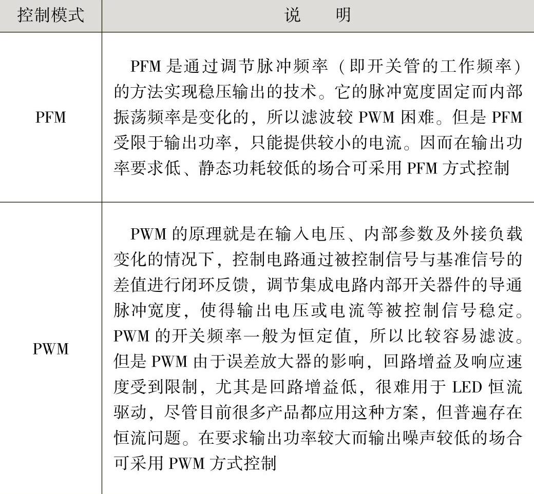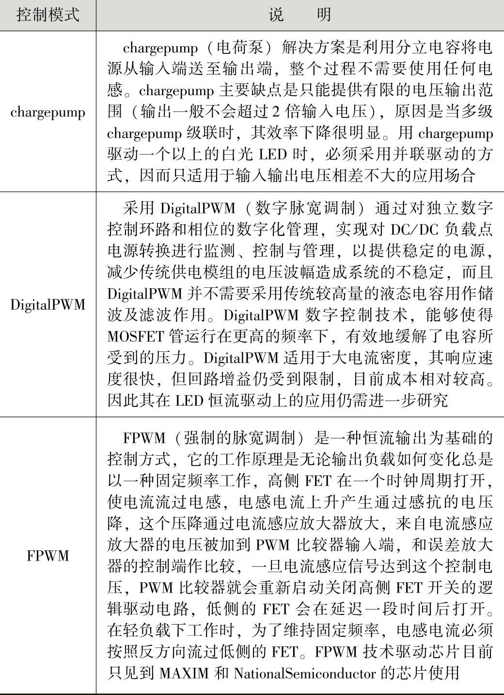 LED驱动电源是把电源供应转换为特定的电压电流以驱动LED发光的电压转换器,通常情况下,LED驱动电源的输入包括市电、低压直流、高压直流、低压高频交流等。而LED驱动电源的输出则大多数为可随LED正向压降值变化而改变电压的恒定电流源。目前,市场上可以买到的微功率电源芯片有以下几种控制模式:PFM、PWM、chargepump、FPWM、PFM/PWM以及pulse-skipPWM、digi-talPWM。其中常见的有PFM、PWM、chargepump以及PFM/PWM,见表1-14。