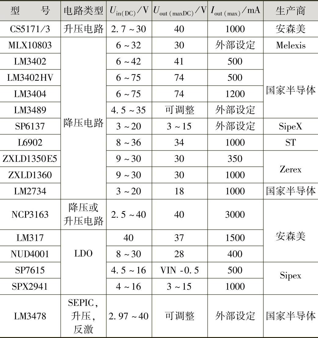 中等电压类IC主要可用作以电池为输入电压源,LED灯饰产品主要以汽车为主,如汽车阅读照明、刹车灯、转向灯等。实现中等电压类驱动的IC型号较多,其主要性能见表1-12。