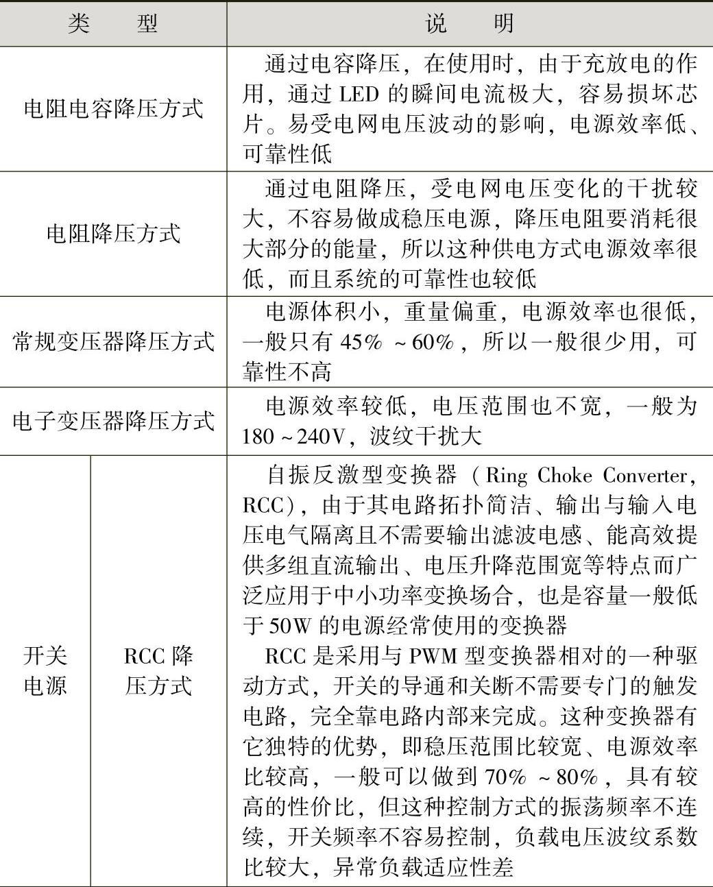 按电路结构方式,可分为电阻电容降压方式、电阻降压方式、常规变压器降压方式、电子变压器降压方式、RCC降压方式和PWM控制方式,见表1-9。