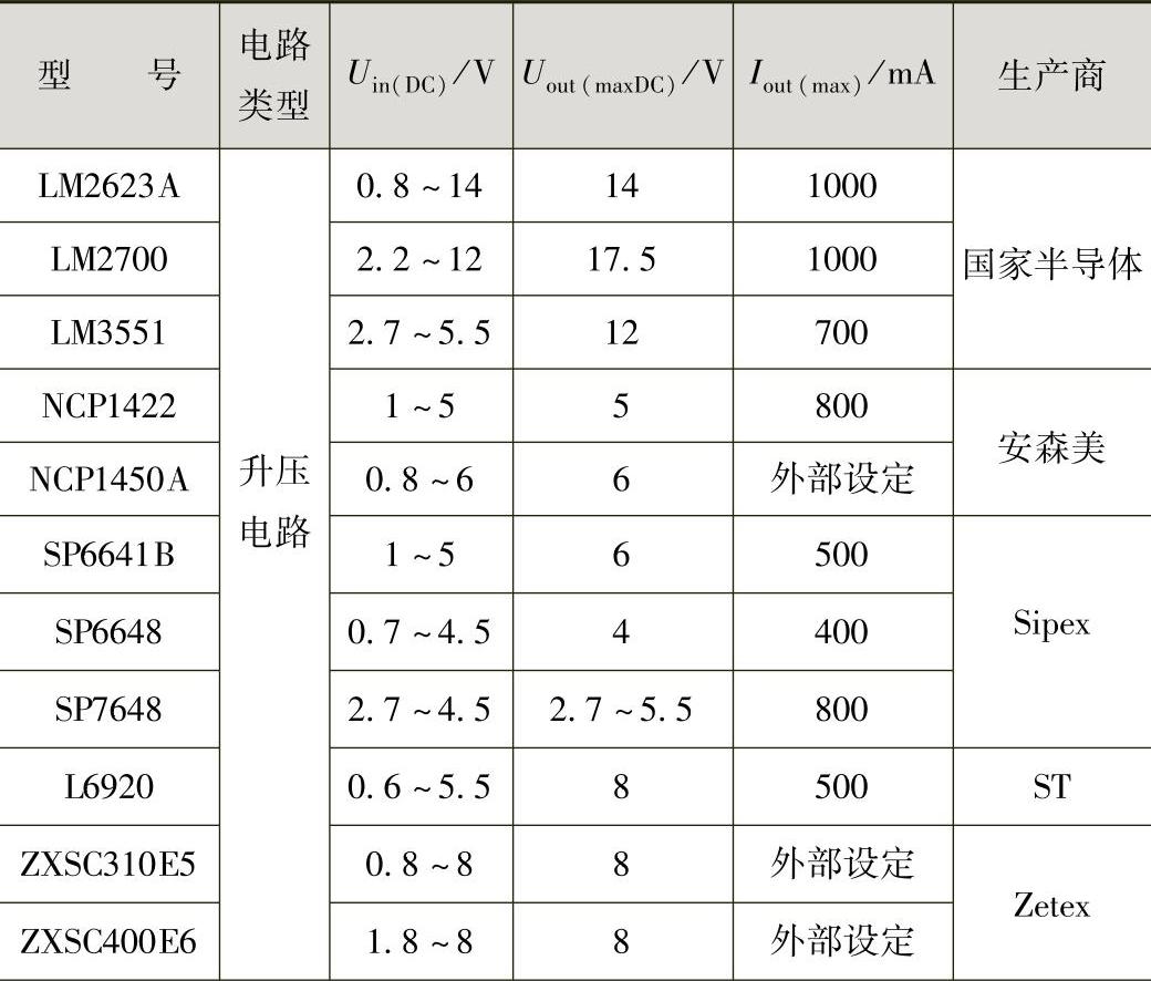 低电压类IC的电路类型主要有降压式与升压式之分,降压式电路又有线性降压与开关降压,升压式多数采用Boost电路。一般来讲,升压转换电路可选择的专用驱动IC较多。可实现低电压类驱动的IC型号较多,几乎大多数的IC公司均有相似的产品。有的驱动IC可接受外加PWM调光控制;有的在IC内部集成了过温度控制功能,结合外电路取样可实现对LED工作电流与温度的监控;有的则加入了频率抖动控制功能,以改善EMI特性。其主要性能见表1-10。