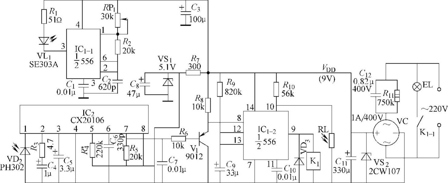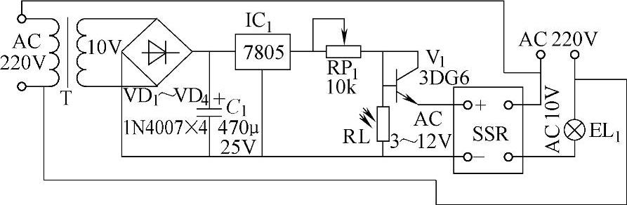 (1)供电线路。220V交流电源一路通过固态继电器SSR与灯泡EL 1 连接;另一路加到电源变压器T的一次侧,从变压器二次侧输出10V交流低压,经VD 1 ~VD 4 桥式整流、 C 1 滤波、IC 1 稳压,得到的5V直流电源提供给光控电路。