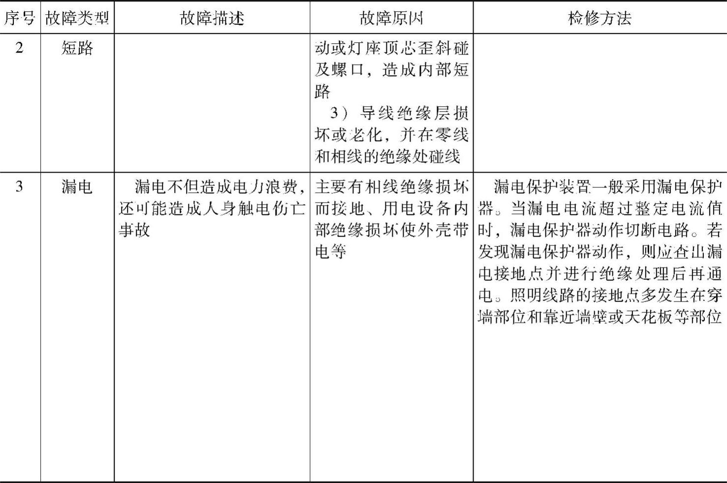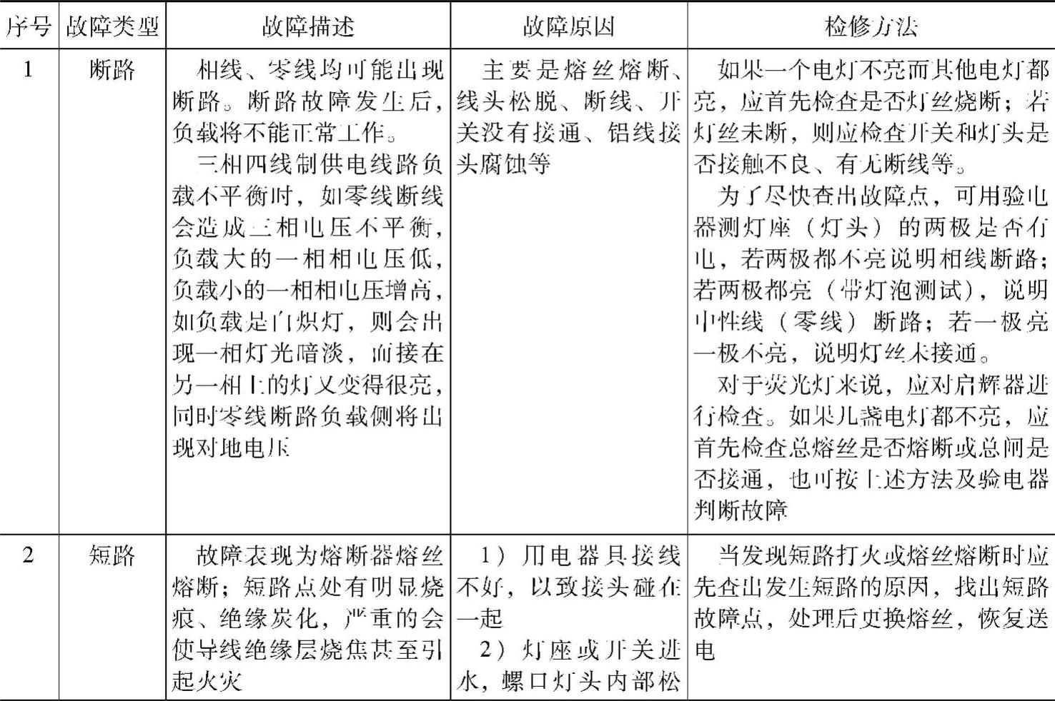 照明线路的常见故障主要有断路、短路和漏电三种,其故障原因及检修方法见表1-3。
