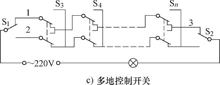 在图1-4c中,根据实际需要可在开关S 1 和S 2 之间接入多个双刀双掷开关,达到多地控制同一盏灯的目的。