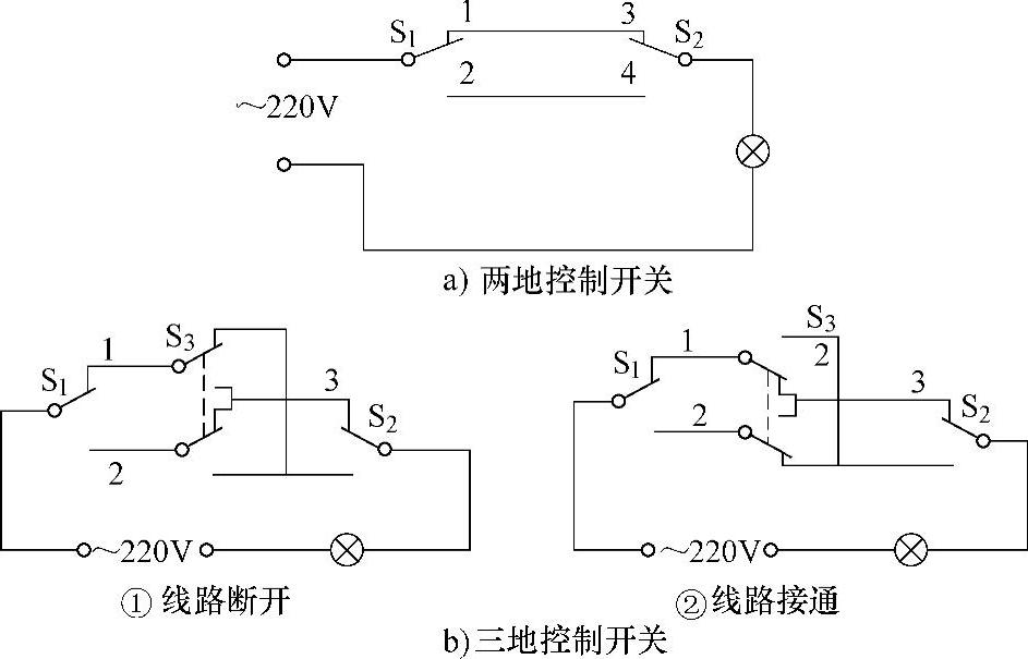 在图1-4b中,在开关S 1 和S 2 之间接入了双刀双掷开关S 3 ,就可以实现三地控制同一盏灯。S 1 、S 2 、S 3 处于图①位置时,线路是断开的,此时无论扳动哪一个开关都可以使线路接通,电灯点亮。S 1 、S 2 、S 3 处于图②位置时,线路是接通的,此时无论扳动哪一个开关都可以使线路断开,电灯熄灭。