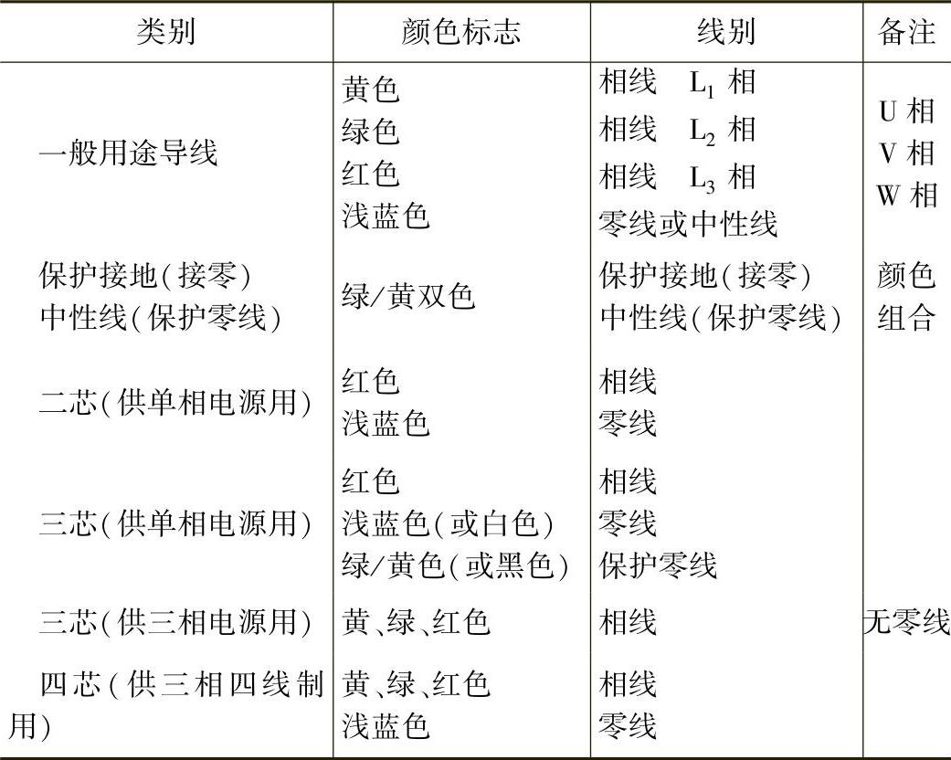 敷设配电线路的导线时,相线L、零线N和保护零线PE应采用不同颜色的导线。导线颜色的相关规定见表1-1。