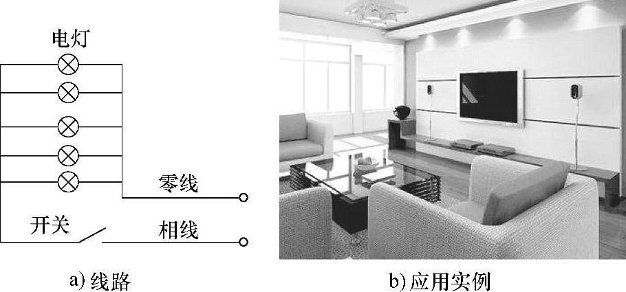 在一些公共场合或家庭的客厅、饭厅(如在客厅吊顶中安装的筒灯、射灯),用一只开关同时控制两盏灯或两盏以上照明灯比较常用,线路原理如图1-3所示。