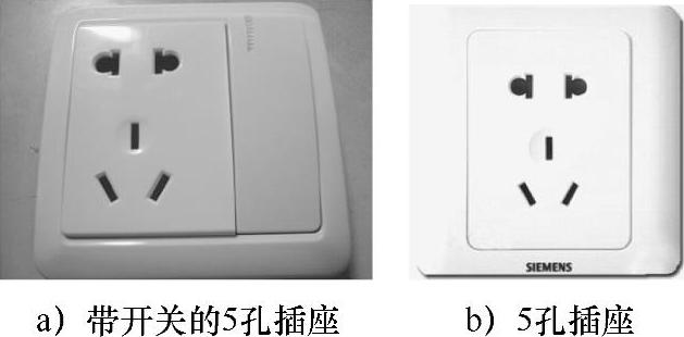 在实际应用时,可选用带开关的5孔插座,也可以选用不带开关的5孔插座(将插座安装在便于使用的位置),如图1-10所示。