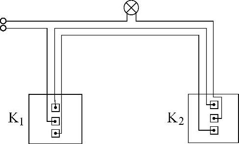 两个或多个开关异地控制一盏灯的照明线路,适用于楼上楼下或在室内的不同地方控制同一盏灯,例如楼梯灯、客厅灯、交换厅过道灯,线路如图1-4所示。不管灯的状态是点亮或是熄灭,都可以用任何一个开关控制电灯的开与关,即变为相反的状态。例如,在楼上/楼下把灯打开/关闭,到楼下/楼上可以把灯关闭/打开。