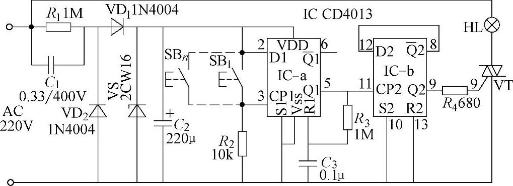 AC220V经降压、整流、滤波、稳压后,在 C 2 上得到9V电压作IC的电源,IC是一块双主从D触发器CD4013,IC-a构成单稳电路,IC-b构成双稳电路。单稳电路的D1端接电源正端,故按动SB 1 ~SB n 中的任一个按钮(开关)都有Q1=D1=1,Q1端高电平经 R 3 对 C 3 充电,当IC-a的复位端 R 1 达到复位转换电平时,便有Q1=0。Q1高电平同时加到IC-b的CP2端,使Q2=1,双向晶闸管受触发导通,灯亮。再按任一个按钮,Q1又输出“1”(以后自动恢复为“0”),CP2又受触发一次,Q2=0,晶闸管VT关断,灯熄。