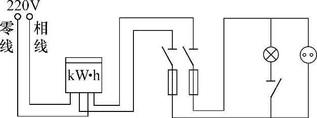 “相线进开关,零线进灯座,灯泡的铜螺套接零线”,这是照明线路的最基本安装方法,如图1-2所示。在接线中要注意灯座上的标号,将相线接在L的接线端子上,将零线接在N的接线端子上。螺口灯座的铜螺套接到零线上。因为一般情况下,零线连着地,这样人体不小心碰到灯座的铜螺套上,人也不会触电。