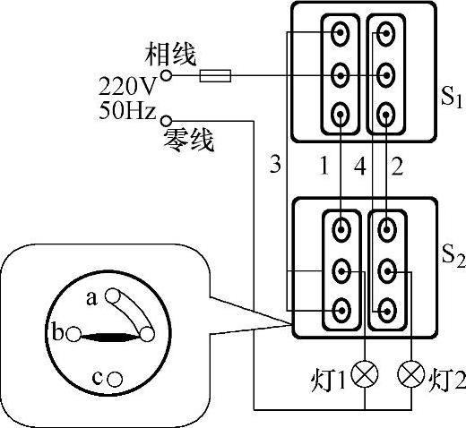 在图1-4a中,当S 1 置于位置“1”,S 2 置于位置“3”时,线路接通,电灯点亮。此时,再扳动任何一个开关都会使线路断开,电灯熄灭。