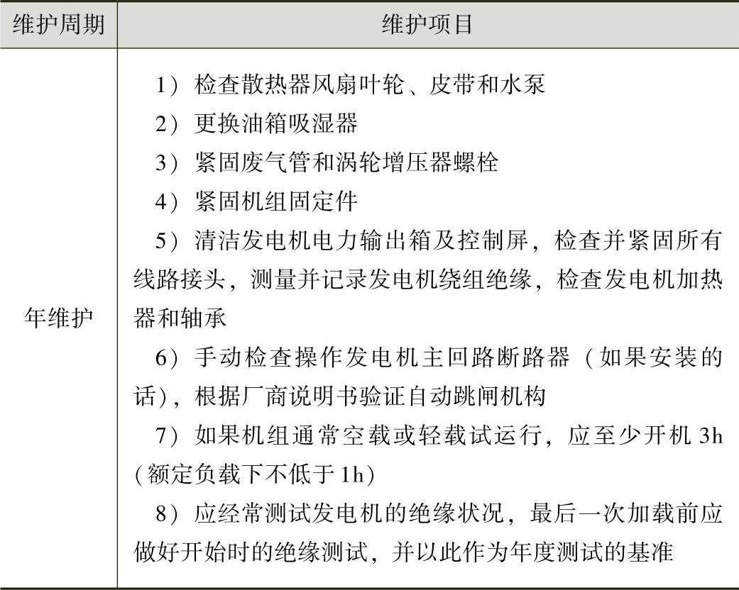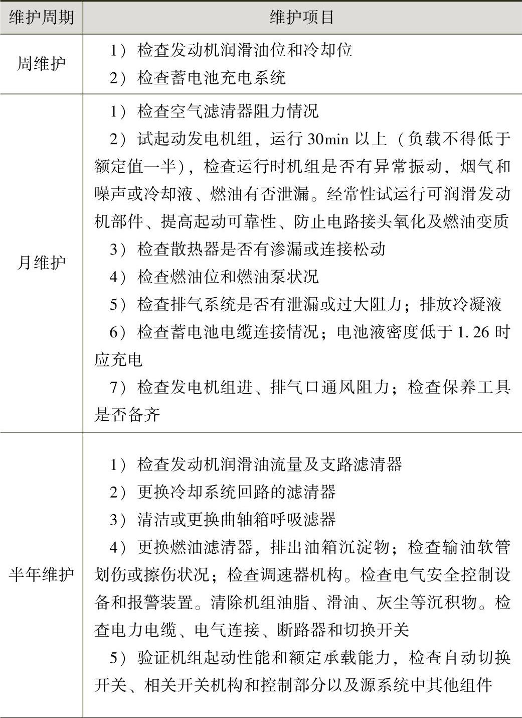 预防性维修、保养方案对于备用电源系统必不可少。常用发电机组维护周期应参考厂方手册,由运行时间确定。由于备用机组不经常使用,维护周期分为周、月、半年、年,其维护项目见表1-15。