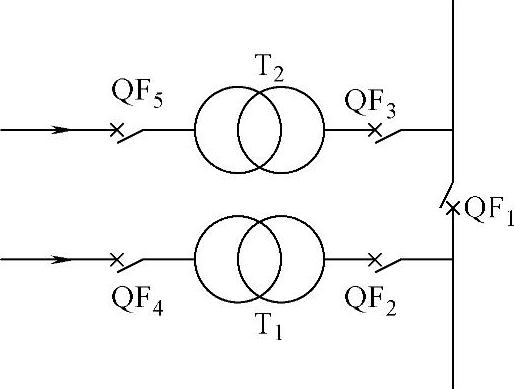 备用电源自动投入装置接线如图1-12所示。正常运行时,变压器T 1 和T 2 同时运行,分段或联络断路器QF 1 断开。当任一台变压器故障或母线低电压时,断开变压器低压侧断路器,而将分段或联络断路器合闸,故障变压器的高压侧断路器QF 4 跳闸时,联动低压断路器QF 2 跳闸。