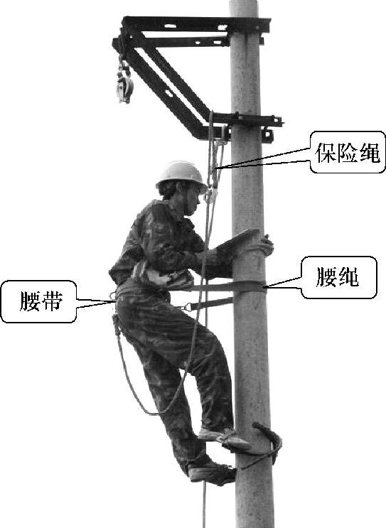 保险绳——用来防止万一失足时坠地摔伤。其一端应可靠地系结在腰带上,另一端用保险钩钩挂在牢固的横担或抱箍上。