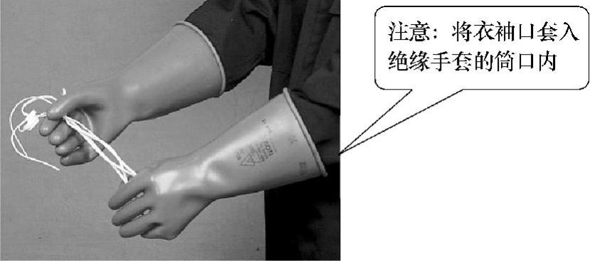 图1-16 绝缘手套的正确穿戴方法