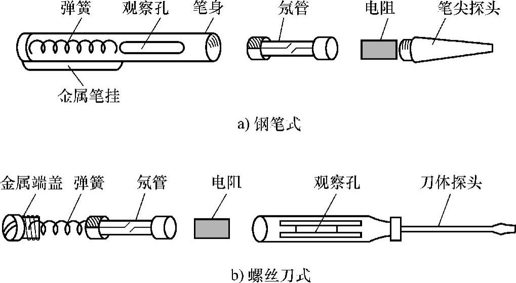(1)禁忌使用前不检查试电笔的好坏:使用试电笔之前,首先要检查电笔内有无安全电阻,然后检查试电笔是否损坏,有无受潮或进水现象,检查合格后方可使用。试电笔的基本结构如图1-1所示。