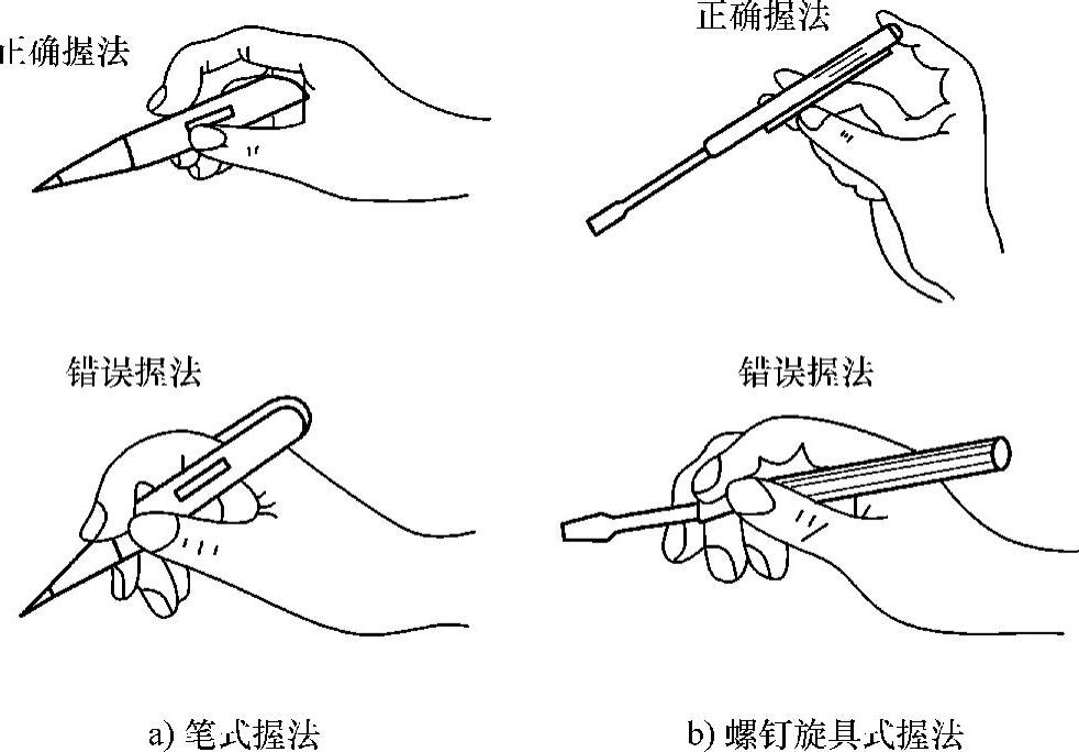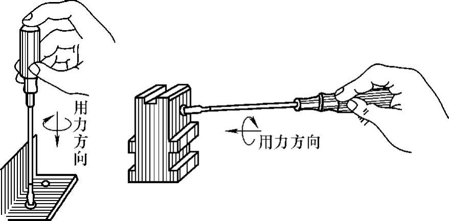 (3)禁忌用力的大小、方向和时刻不正确。应先将螺丝刀头与螺钉槽相啮合后才能用力,禁忌用力太大或用力太小。用力的正确方向如图1-7所示。