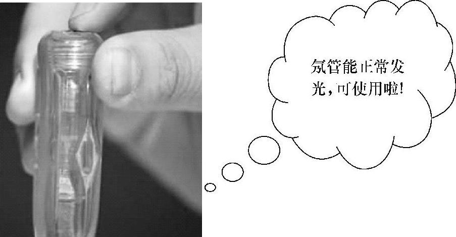 (3)禁忌不验电检查:在使用试电笔测量电气设备是否带电之前,先将试电笔在有电源的部位检查一下氖管是否能正常发光,能正常发光,方可使用,如图1-4所示。